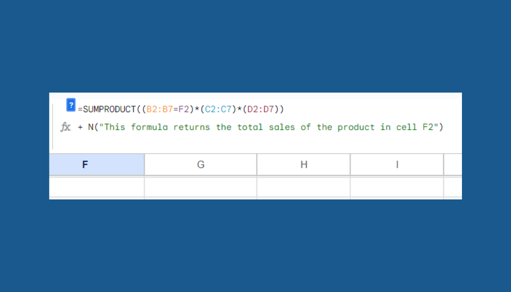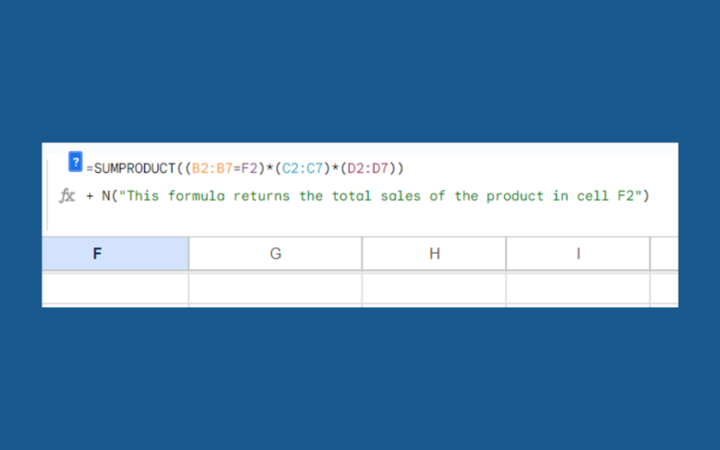 =SUMPRODUCT((B2:B7=F2)*(C2:C7)*(D2:D7)) + N("This formula returns the total sales of the product in cell F2")