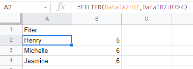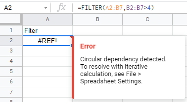 To fix this error, we should exclude the formula from the range making the formula to be =FILTER(A2:B,B2:B>4)
