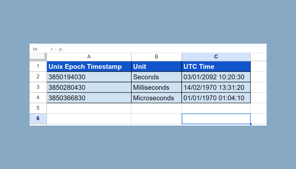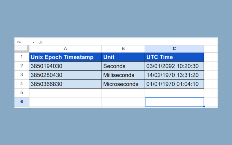 In the spreadsheet above, we can see the Unix epoch timestamps in different units of time, such as seconds, milliseconds, and microseconds. Our goal is to convert these timestamps into a DateTime in Universal Time Coordinated.