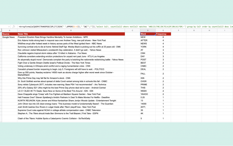 Our goal here is to identify the most frequently occurring keywords in today’s news.I have navigated to cell D2 to insert my formula: