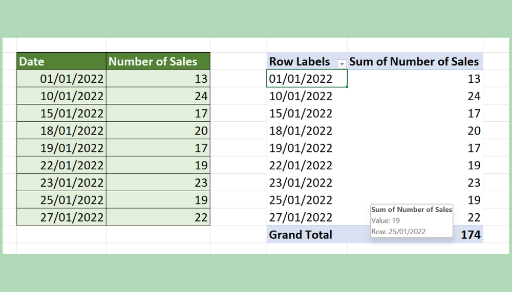 13. And tada! We have ungrouped the data by week in the pivot table.