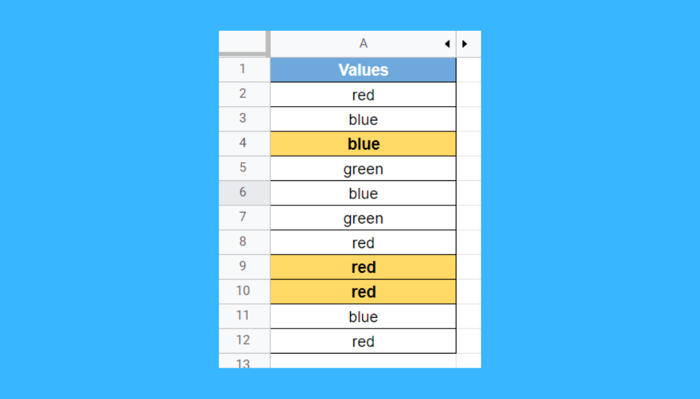 - After applying conditional formatting, Google Sheets should now highlight cells with adjacent duplicates. In the example below, cells with duplicates are highlighted with a yellow background.