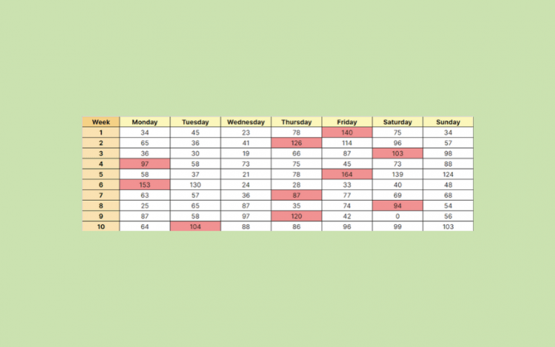 We used conditional formatting to highlight the max value in each row with an orange background. This way we can easily see the days that had the highest number of visitors each week.