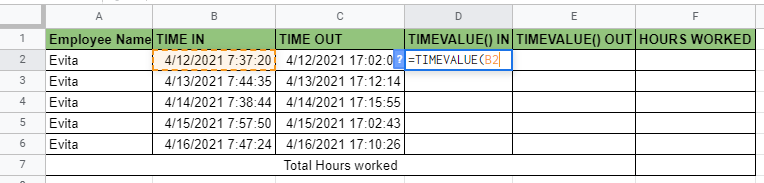 You can see the TIMEVALUE function in action in Column D for Time in and Column E for Time out.