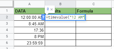As you can see, the TIMEVALUE function returns the fraction of a 24-hour day the time represents. You can also see on the example given different time formats that Google sheets recognize.