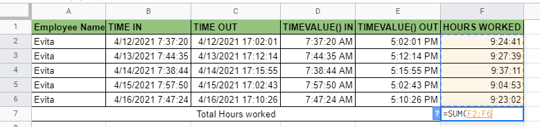 - And voila, we now have the hours worked by Evita for April 12, 2021. Now, all we have to do is copy the formula down to the remaining rows as we did in our last example. Then simply sum up all the hours worked to get the result of Evita’s all-week worked hours.