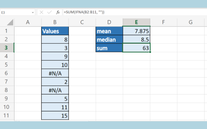 Lastly, we also want to calculate the sum of the data set while ignoring the #N/A error values. To do this, we will combine the SUM and IFNA functions.