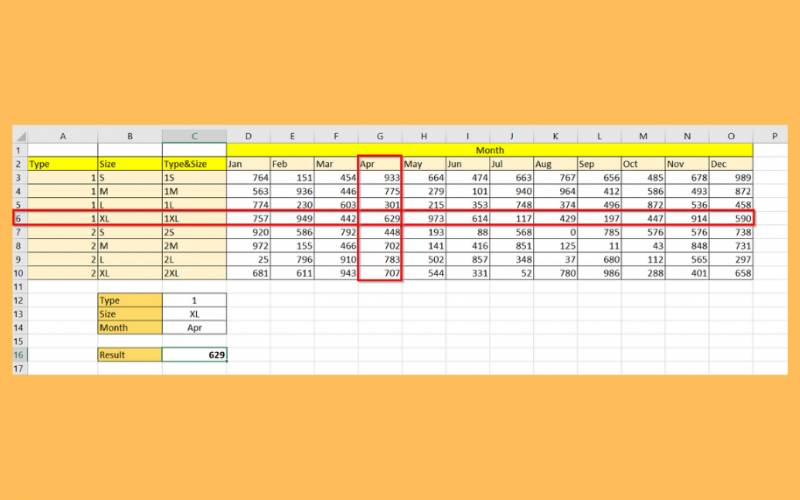 =INDEX(D3:O10,MATCH(C12&C13,C3:C10,0),MATCH(C14,D2:O2,0))