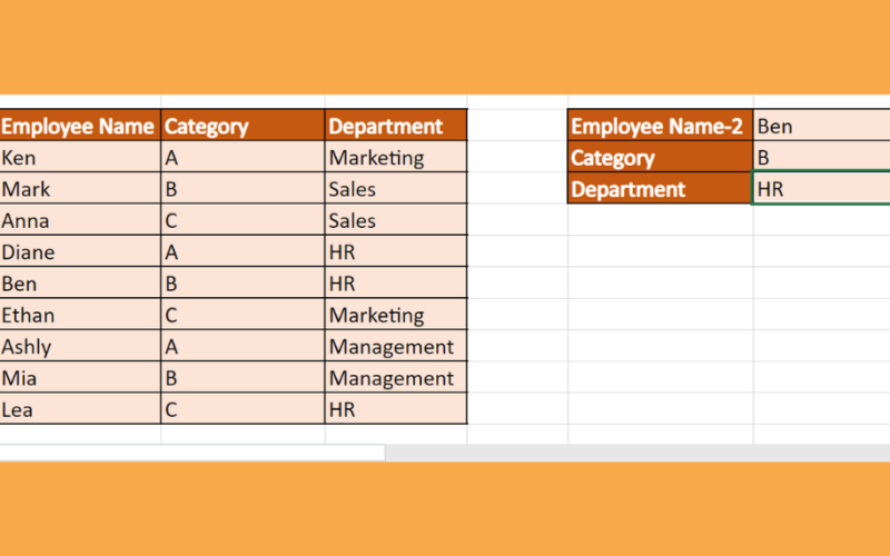 Firstly, we will utilize the VLOOKUP function to match two columns and return a third in Excel. Let’s say we have the same dataset from the sample scenario, which contains the employee name and department.