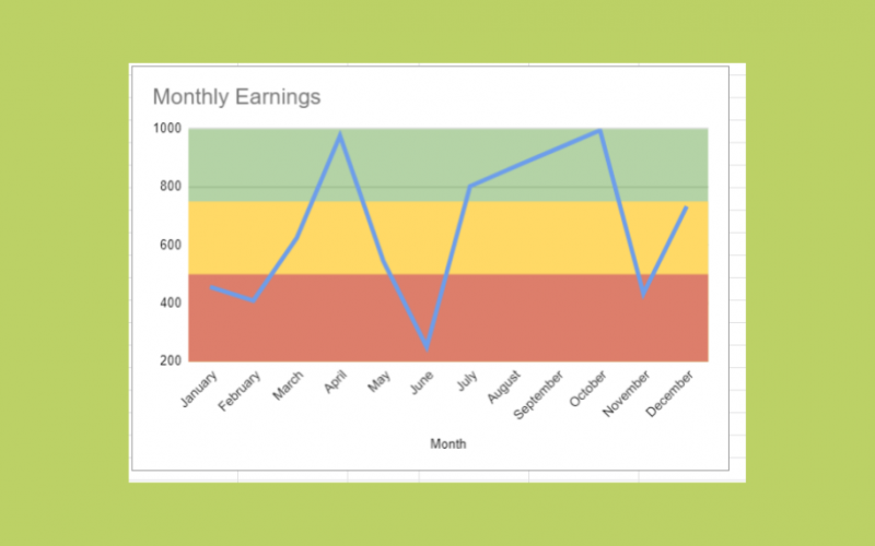In the example below, we’ve added multiple shaded ranges to our line chart. The area below the $500 mark is shaded red. We’ve colored the area above the $750 mark with green. The area between these two limits is shaded yellow.